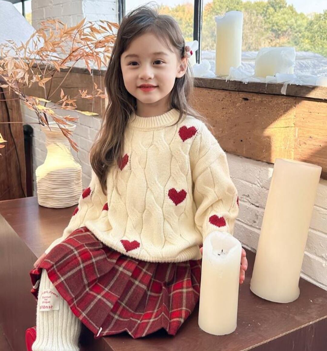 ハート柄の可愛らしいセーターが新登場!女の子にぴったりのデザインで、白とピンクの2色展開です。赤いハートがポイントとなり、さらに可愛さがアップします。寒い季節にぴったりのアイテムで、着心地も抜群ですよ。