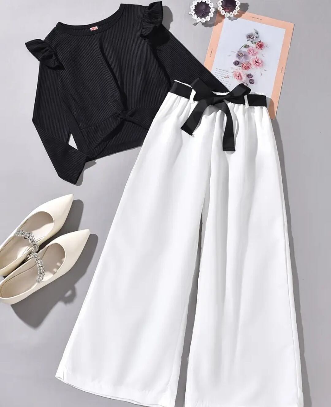 シックな雰囲気の長袖トップスに、ワイドパンツとリボンを合わせた可愛らしい3点セットです。大人っぽいスタイルを楽しむことができ、上品な印象を与えます。ホワイトのワイドパンツには、ブラックのリボンがアクセントとなり、コーディネートをより一層引き立てます。シーンを選ばず、幅広いスタイルにマッチするので、デイリー使いからパーティーシーンまで幅広く活躍してくれます。