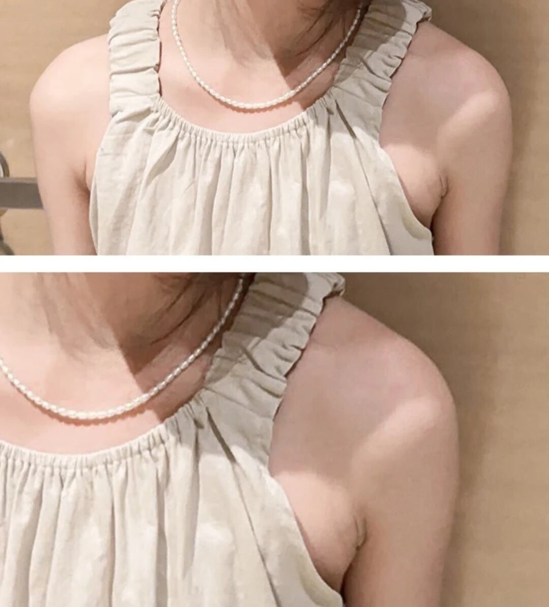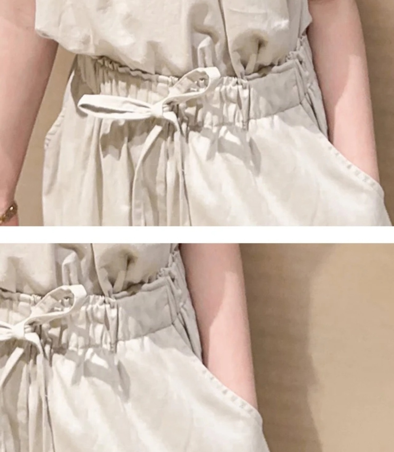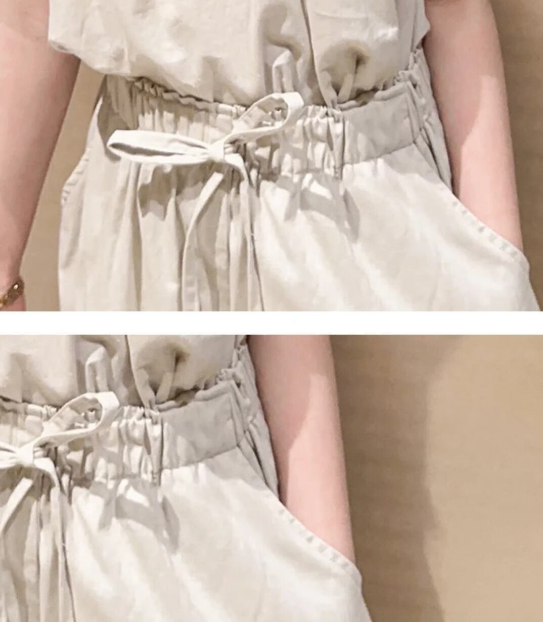 このセットアップは、くすみ色が特徴的で、夏の陽射しを優しく受け止めるような印象です。トップスは髪の毛をアップにするとより華やかに見えますので、特別な日やお出かけにもぴったりです。