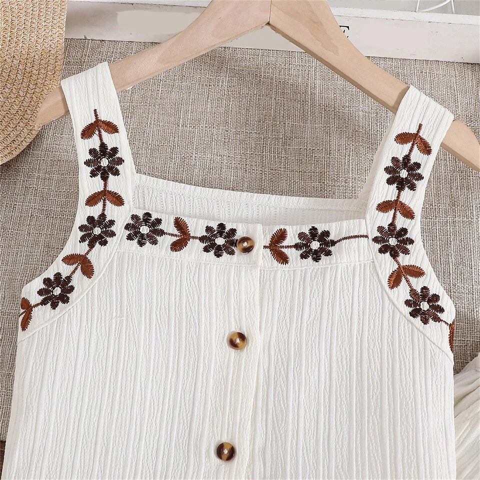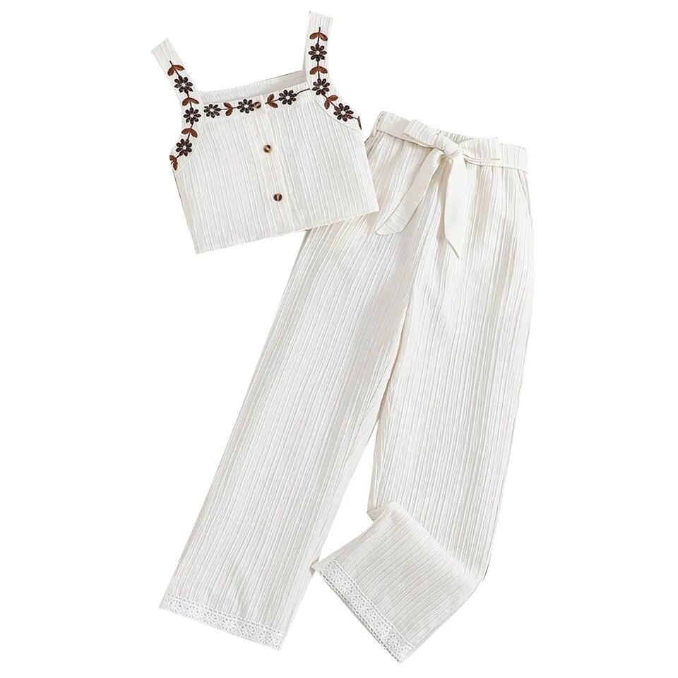 クロップタンクとワイドパンツの可愛いセットがご予約受付中!ホワイトカラーのクロップタンクはノースリーブでお花のデザインが施され、女の子らしい可愛らしさが漂います。肩部分にはお花がプリントされていて、7歳から9歳くらいのお子さまにぴったりのアイテムです。お出かけやイベントなど様々なシーンで活躍すること間違いなし!