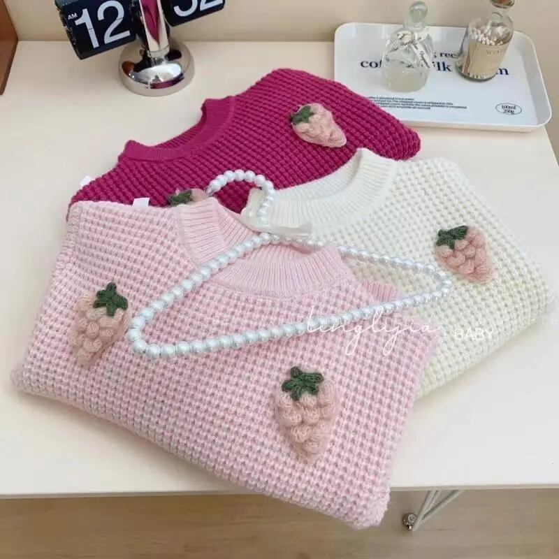 ラウンドネックセーター Strawberryモチーフは、可愛らしいいちごモチーフが所々に散りばめられたアイテムです。ヴィヴィッドピンク、パステルピンク、ホワイトの3色展開で、お好みに合わせてお選びいただけます。シンプルなデザインながらも、モチーフがアクセントとなり、コーディネートに華やかさをプラスしてくれます。